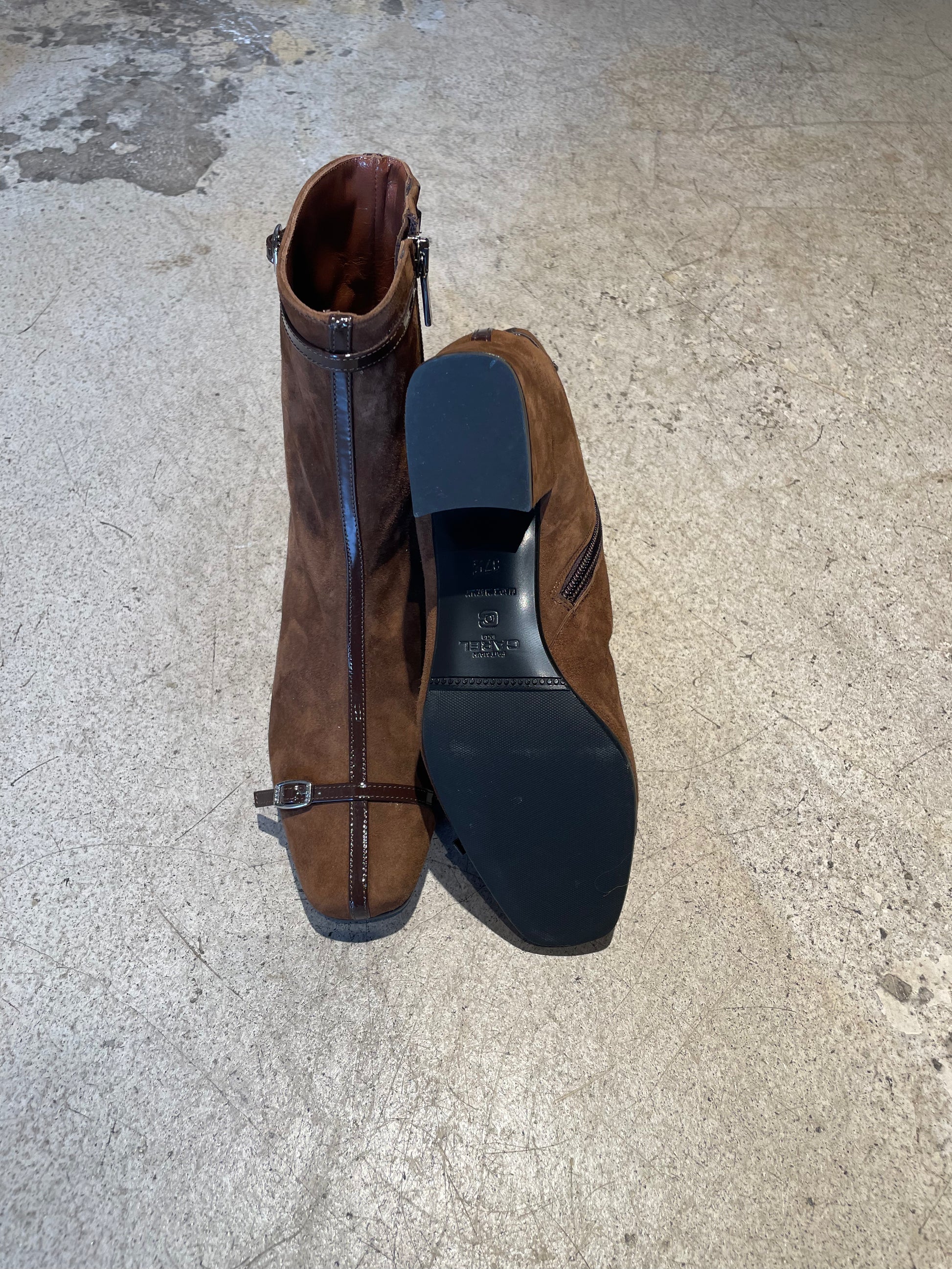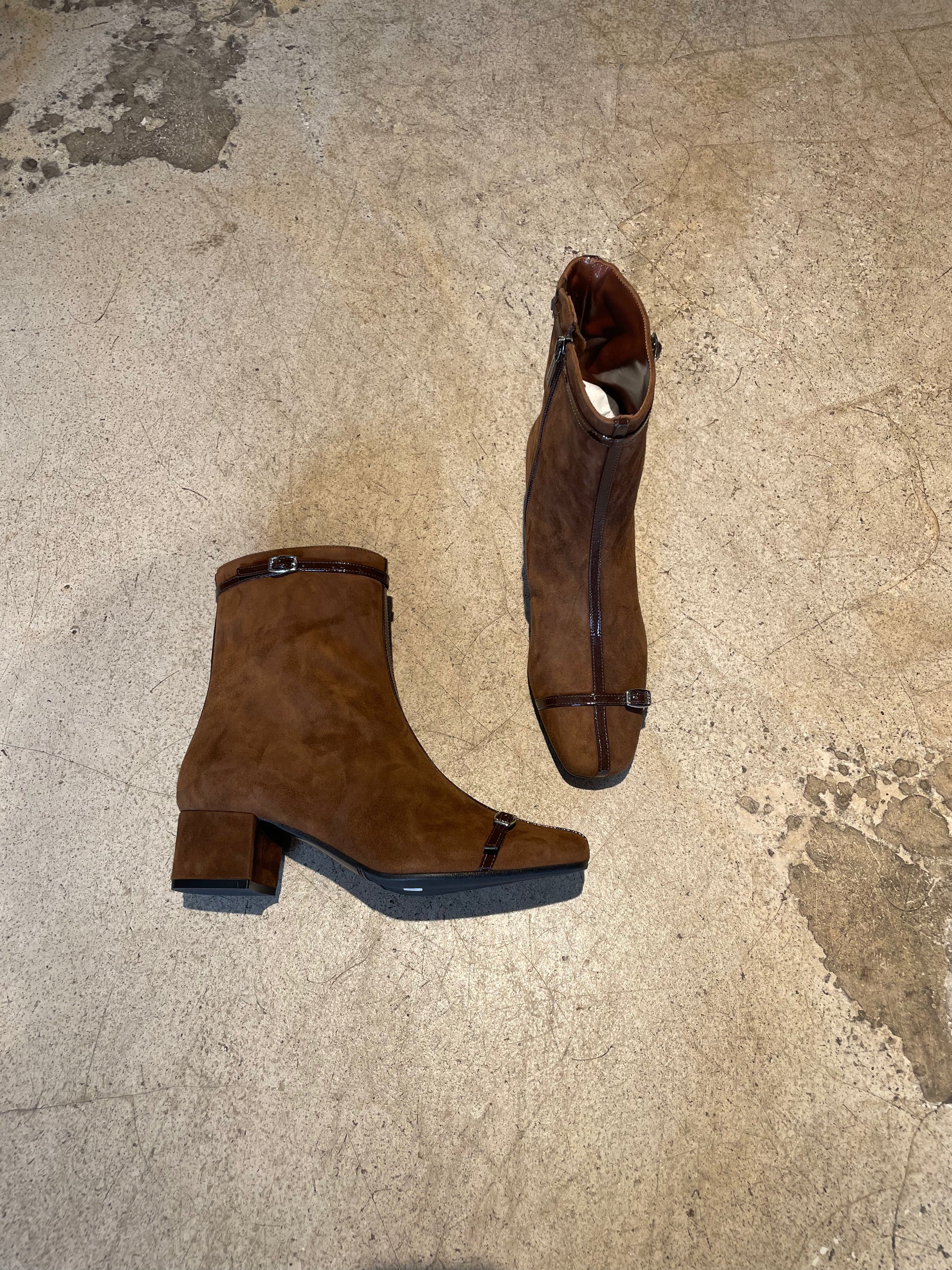 Les bottines Start arborent la signature de Carel : des brides décoratives à boucle, autour de la cheville et à l’avant, créant l’illusion d’un bout droit.