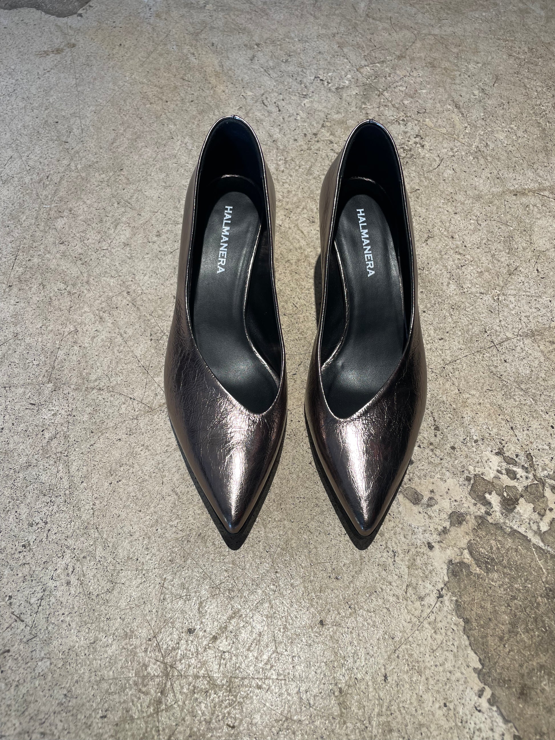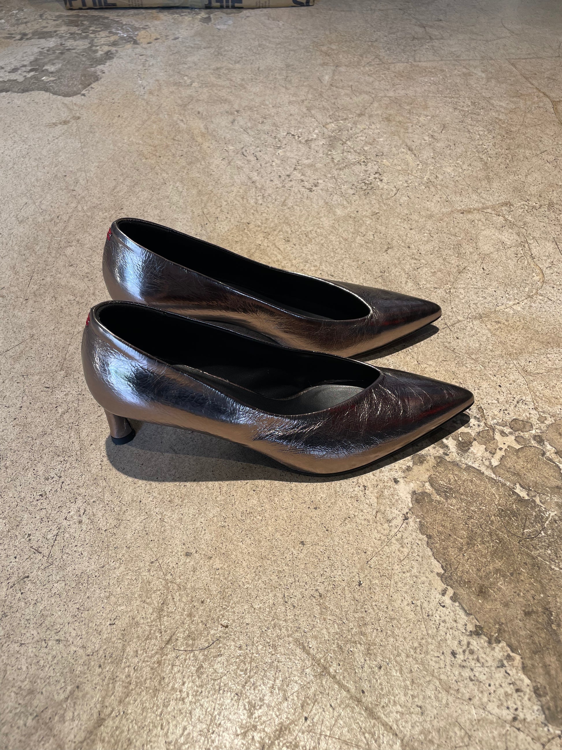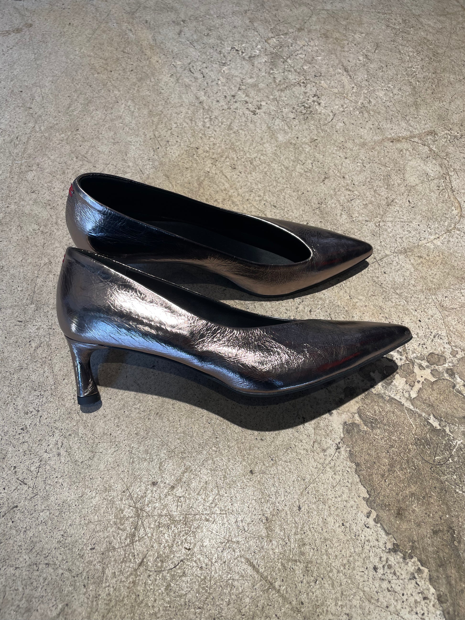 Escarpins argent foncé avec décolleté assimetrique.