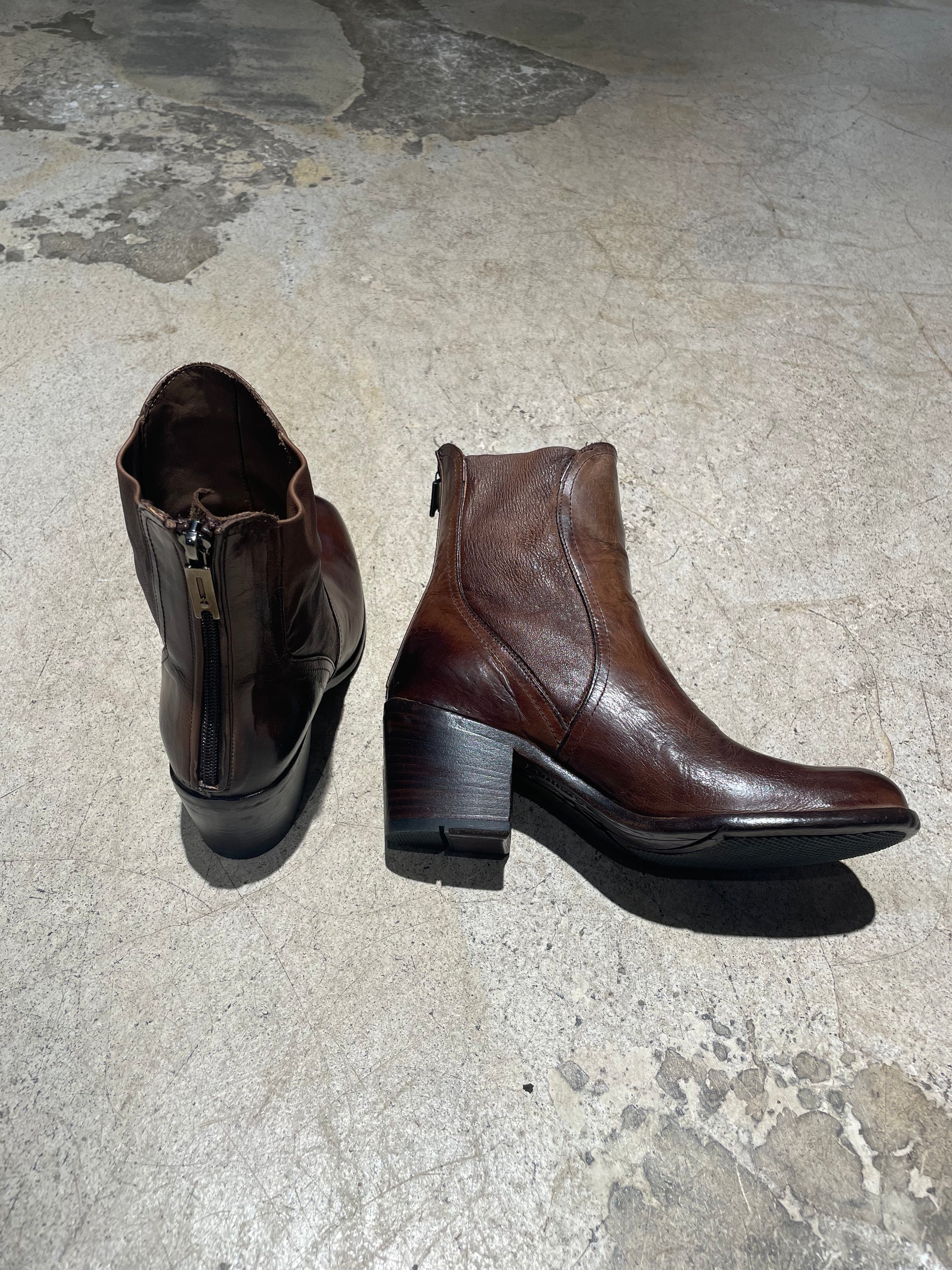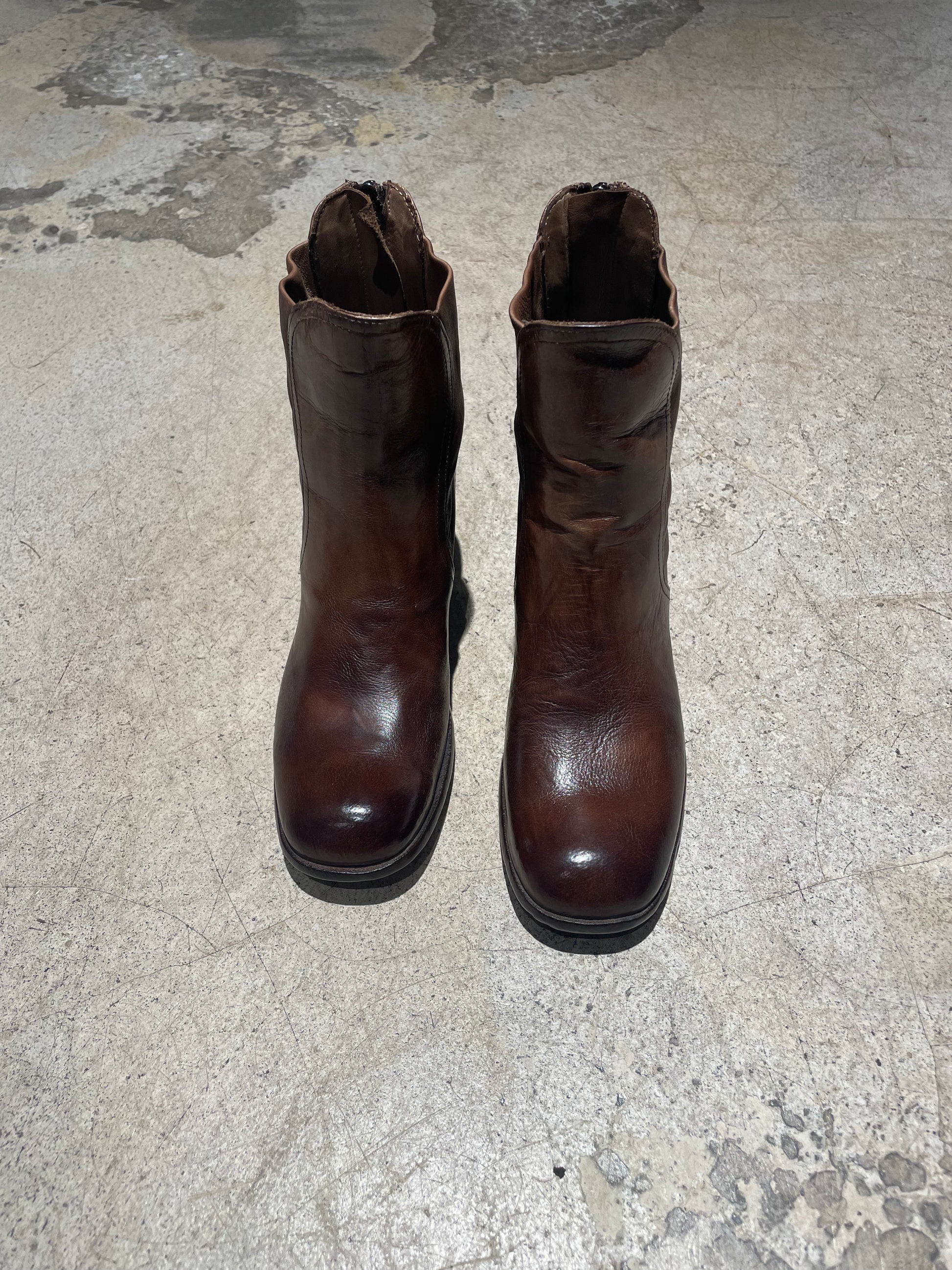 Bottines à talons cognac avec bout carré arrondi, empiècements en cuir stretch sur les cotés, fermeture Éclair à l'arrière, et semelles antidérapantes.